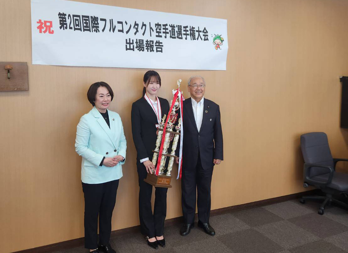 7/10(木)に第2回国際フルコンタクト空手道選手権大会女子中量級第3位に入賞した村上莉菜選手が、大東市市役所の逢坂伸子市長と大東市市議会の小南いちお議長に大会結果報告の表敬訪問をさせて頂きました。
