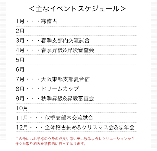 キッズ・ジュニアクラスではイベント、大会なども沢山あります!お子様の成長や頑張っている姿を写真やビデオに撮れる機会ですからぜひ、撮りましょう!また、経験も積み、より本格的に練習が出来るようにスキルアップの出来るクラスもありますので、やりがいも十分です。